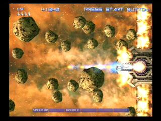 弾がやんだらオプションをまとめてコアに撃ち込みます。後ろから岩が飛んでくるのでいざとなったら破壊した遮蔽版のあたりに潜り込みましょう。ただしかなり見づらいので死にやすいですが。ここで撃ちこめば次の弾幕が来る前に倒せます。