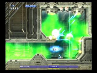ローリングコアは最初弱点を出してこないのでまずは避けに徹します。レーザーがやんだあとは自機を狙った極太レーザーや体当たりをしてくるので、あらかじめ回避の準備をしておきます。弱点を開いたら画像のようにオプションをまとめて攻撃します。遮蔽版が撃ち返すので気をつけましょう。レーザーの砲台は破壊することができます。