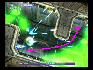 後ろスクロールはハッチが自機を狙うザコを吐いてきます。弾切れを起こして撃ちもらし直撃をくらいやすいので、あらかじめハッチを破壊してしまうか、ザコをうまく誘導してやり過ごします。