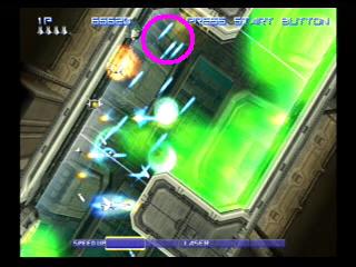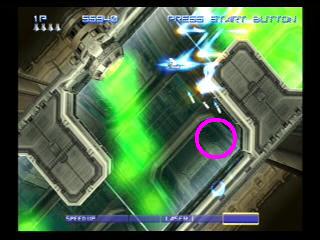 サークルコアは出現時に画面の隅にいると死ぬので真ん中あたりで待ちます。コアを持つ部分が周りに沿って回転するので、それに先行するように動くと、オプションがコア部分に重なって攻撃できます。途中で細かいレーザーをたくさん撃ってくるのでその前に倒すとよいでしょう。すぐに倒す場合は図のようにオプションを固めてコアを狙います。