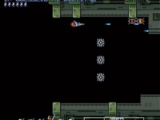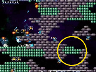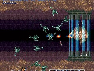 上下にツタのようなものが動くところは真ん中のピンク色のところを8発撃ち込むと通路が開きます。後ろからカプセル持ちのザコが大量に出てくるので慣れてきたら稼ぐといいでしょう。カプセルゲージを1周させると1000点のボーナスが入ります。この辺でレーザーを装備します。