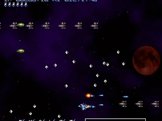 前衛の最後で大きめの弾をばらまく敵が出てくるので弾を出される前に倒すようにしましょう。自機と一定の距離を保つため自機が左にいくと左に移動してくるので追い詰められないように。
